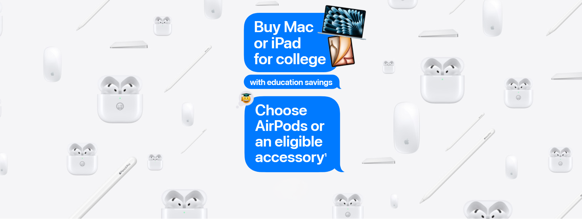 1. Available for Qualified Purchasers only. Qualified Purchasers purchasing an eligible Mac/iPad (“Eligible Product”) with eligible AirPods/accessory (“Promotion Product”) from a Qualifying Location through September 30, 2025 will receive Promotion Savings (up to $199, not to exceed the price of the Promotion Product). Customers will be charged for all items in their cart, including the Promotion Product. Only one Promotion Product per Eligible Product per Qualified Purchaser. Offer subject to availability. While supplies last. Additional restrictions apply. View full offer terms here.